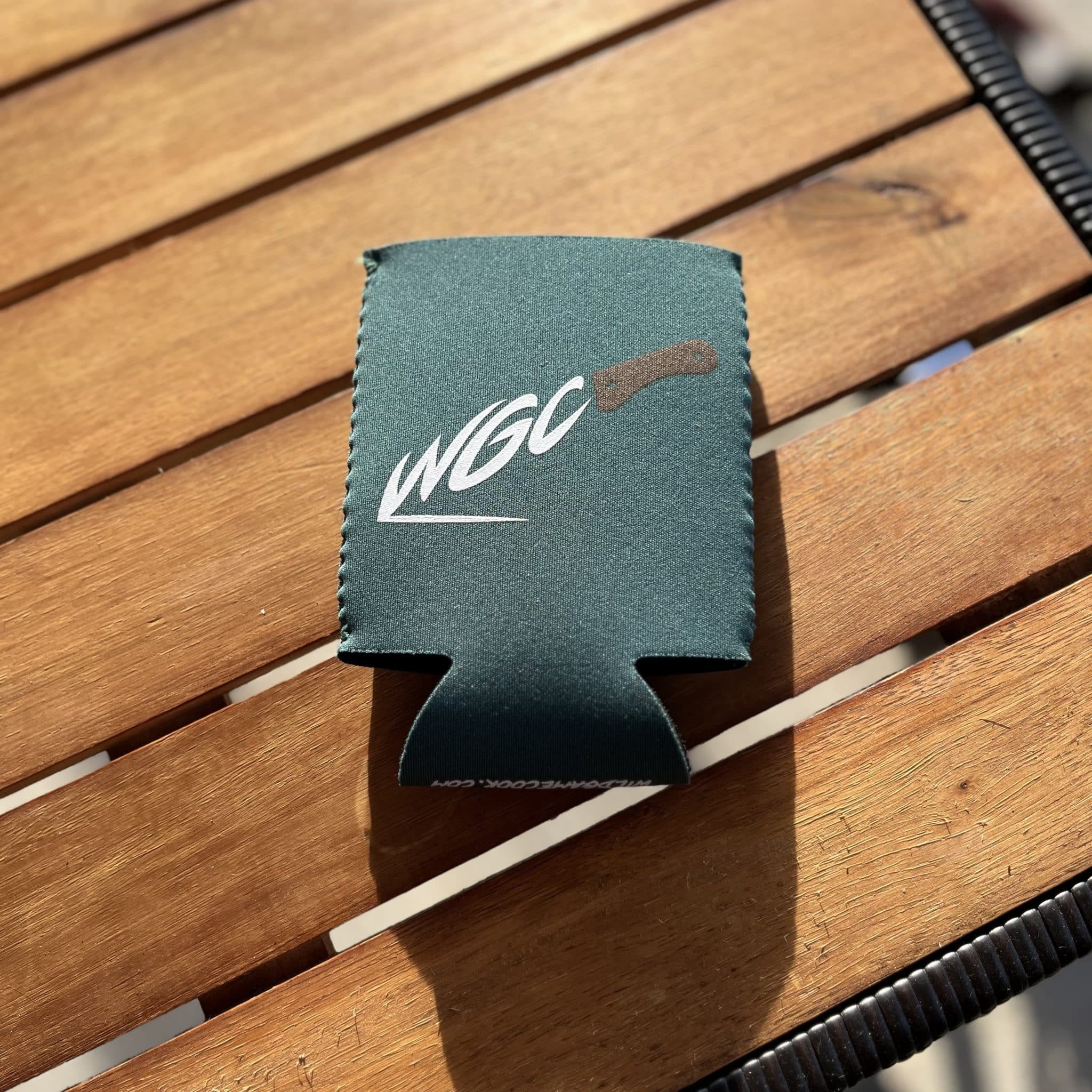 Neoprene Collapsible Coozie. Wild Game Cook on one side and the WGC knife icon on the other. Fits regular cans and bottles.